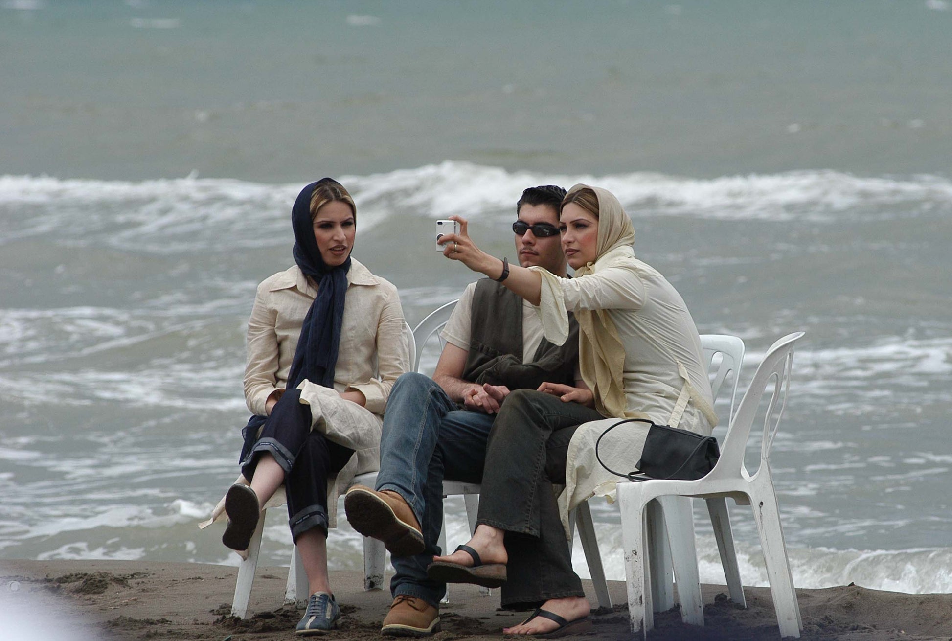 Two girls and a boy are taking a selfie by the Caspian Sea in the north of Iran. Iranian women are not allowed to have free relations with the opposite sex without observing Sharia standards, and if caught by the police, they will be fined and imprisoned. January 4th, 2002.