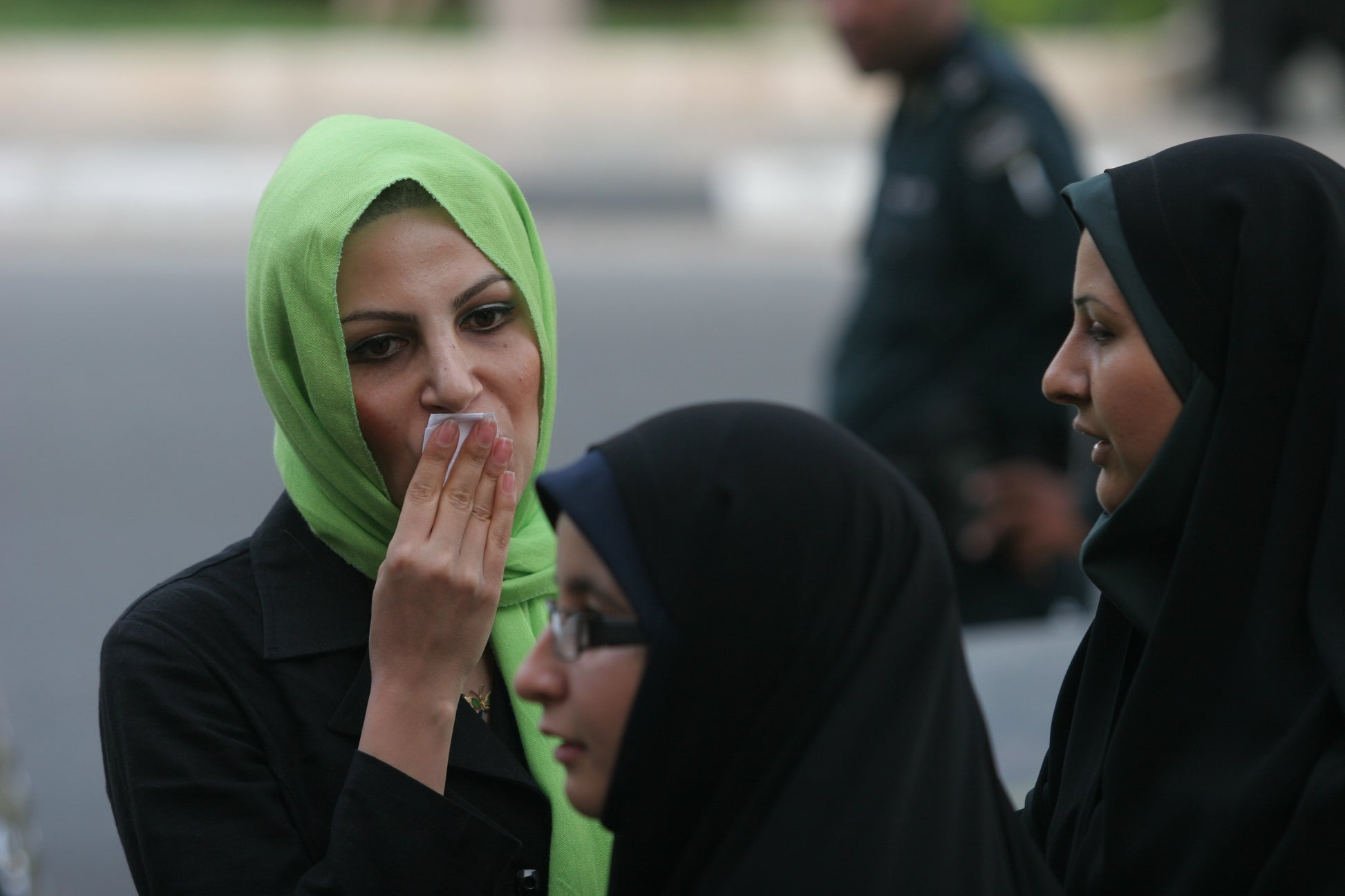 A woman wipes off her lipstick at the insistence of the morality police officer in eastern Tehran. The morality police officers in Iran arrest women whose clothing does not conform to Islamic laws by stopping them on the streets and then taking them to the detention centers. July 25th, 2006.