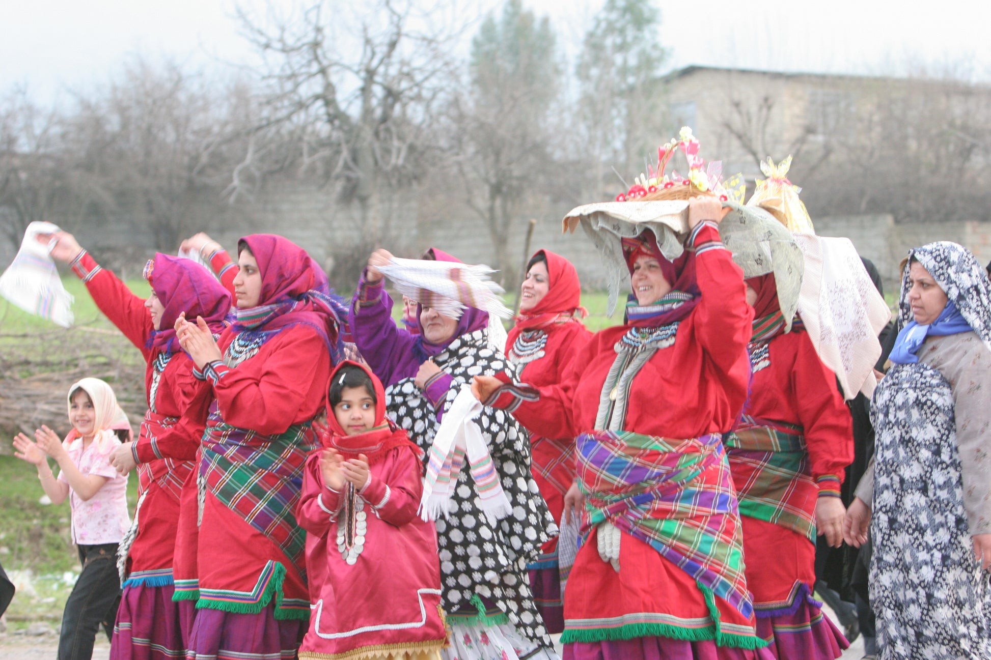 Women carrying symbolic items for the wedding ceremony to the bride's house in Ramyan village of Golestan province. April 28th, 2005.