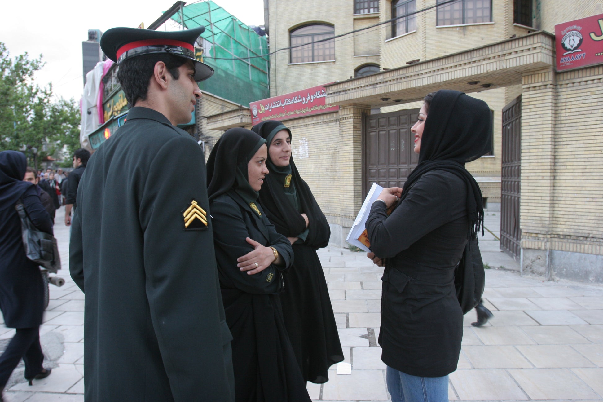 Morality police (Irshad) officers warn a woman about her hijab in Vanak Square, Tehran. Irshad patrol agents in Iran arrest women whose clothing is not in accordance with Islamic laws and take them to the detention centers. June 3rd, 2015.
